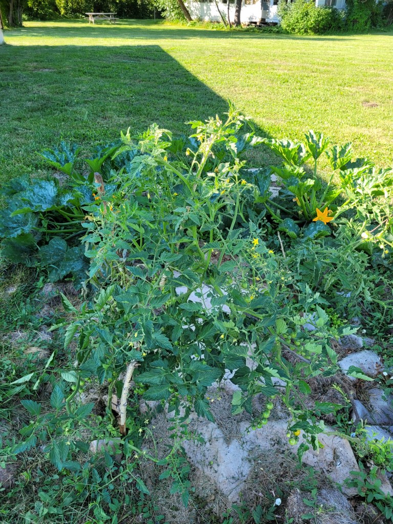 Today the garden is in it’s jungle phase. The tomatoes have completely outgrown the pitiful sticks I used. Zucchini plants are pumping out fruit daily. The basil grew really patchy, but I use it to cook with every chance I get.